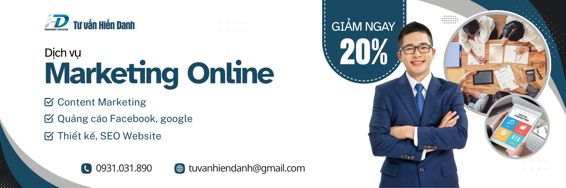 Hiến Danh đồng hành cùng doanh nghiệp của bạn với giải pháp Marketing Online toàn diện như Thiết kế Website, SEO Website, quảng cáo Google, quảng cáo Facebook, Email Marketing, Content Marketing và nhiều công cụ khác.